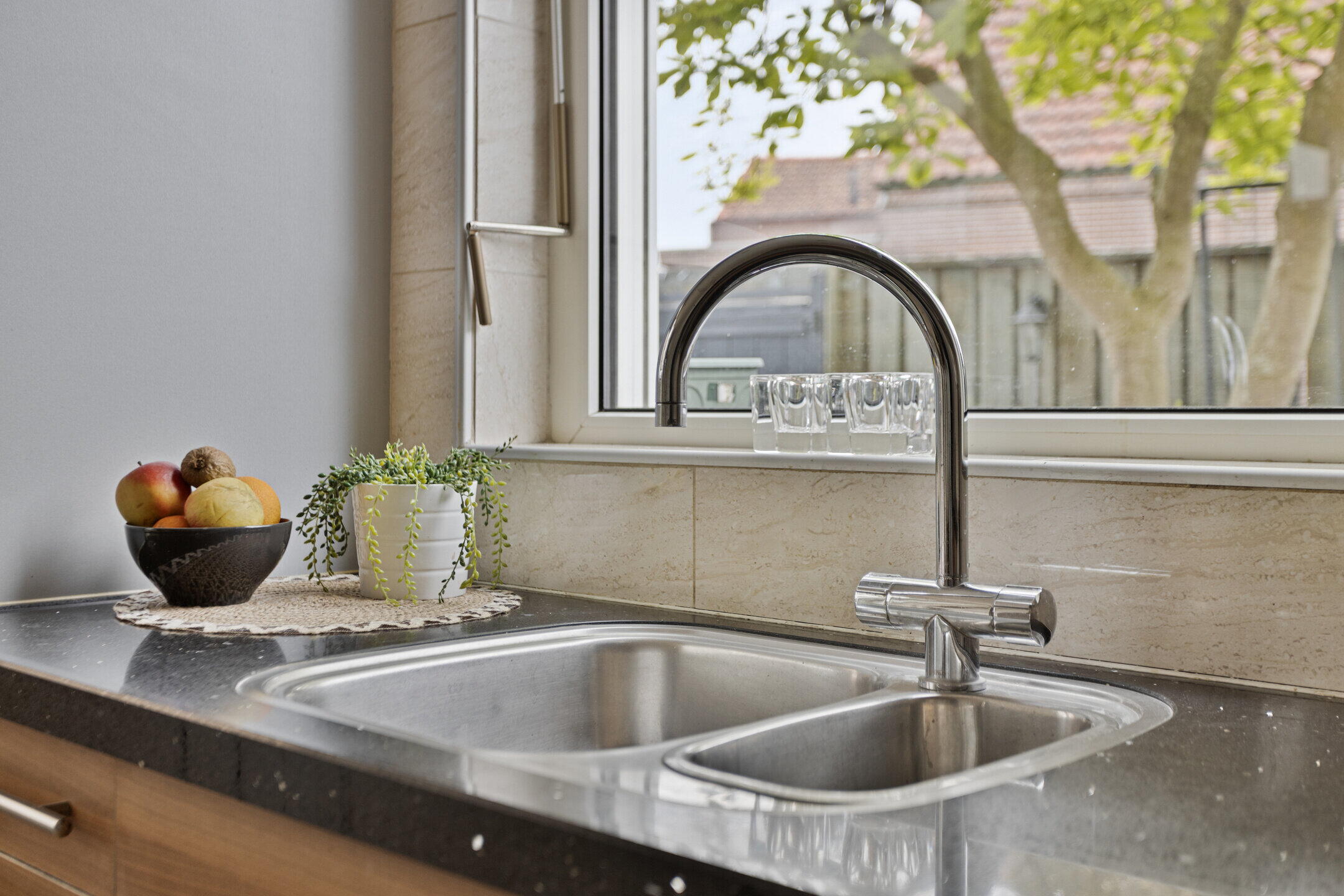 De woonkamer is royaal opgezet met een mooie beige natuurstenen vloer, grote raampartijen met rolluiken (elektrisch aan de achterzijde) en een fijne indeling voor zowel een zit- als eethoek. De woonkamer loopt naadloos over in de luxe open keuken, uitgevoerd in houtlook met een stijlvol zwart granieten keukenblad. De keuken biedt veel werkruimte, kastruimte en is ideaal voor iedereen die graag kookt of gezellig tafelt.